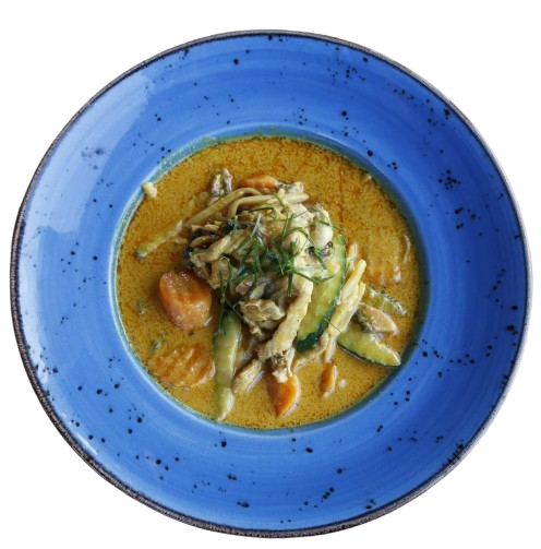 Aromatyczne curry z trawą cytrynową, galangalem, liśćmi limonki gotowane z bambusa, cukinii, marchwi, grzybów i mleka kokosowego podawane z ryżem jaśminowym