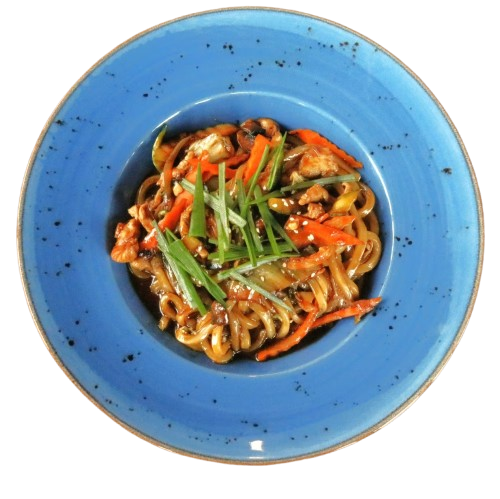 Zasmażany, gruby, miękki makaron pszenny z pieczarkami, marchewką, kapustą pekińską, cebulą, cukinią i grzybami w sosie sojowym